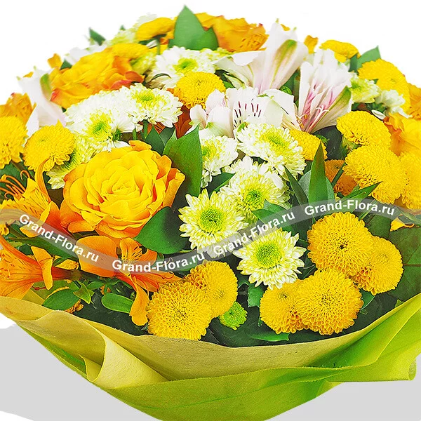 ДЕЛЮКС: роза желтая /оранжевая- 11 шт, хризантема кустовая желтая - 7 шт, альстромерия желтая - 5 шт, альстромерия белая - 4 шт, хризантема кустовая белая - 7 шт, рускус, фетр зеленый.  Примерный объем букета 40 и более см.